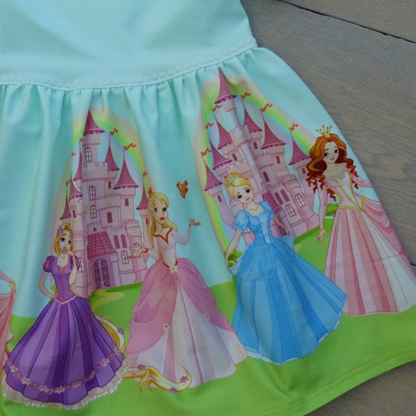 Jurk grote print : uni groenblauw, prinsessenprint rok
