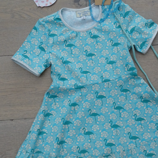 Jurk turquoise blauw flamingo, korte mouw, A-lijn rok
