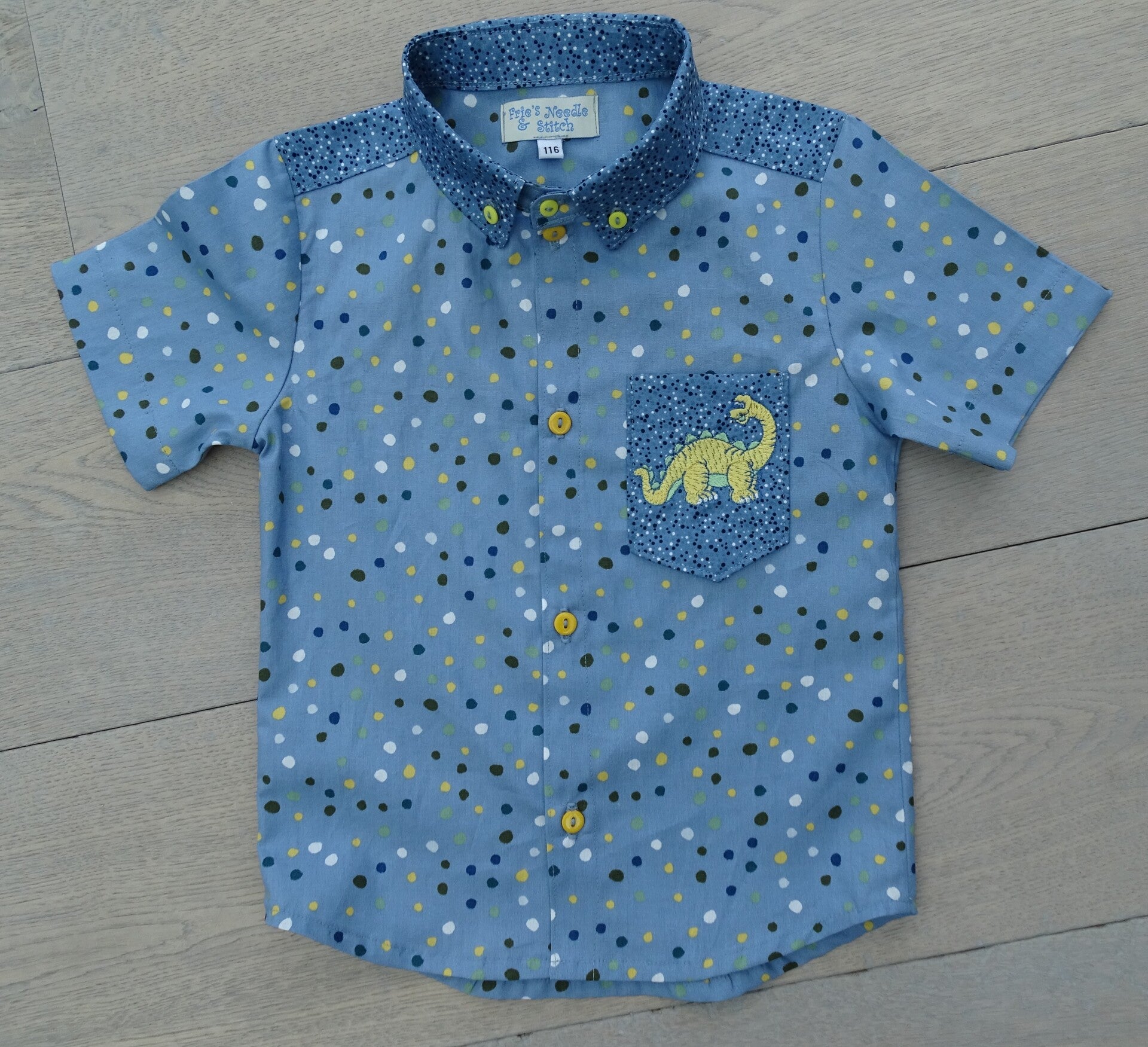 Volledig in 1 stof, of combinatie grijsblauw met kleine stippen