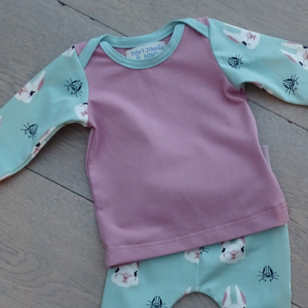 Babyshirt, oudroze/konijntjes kleine print, halsopening overslag