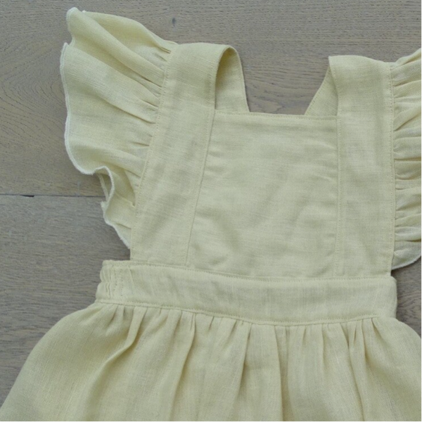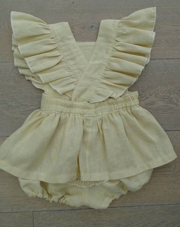 Jurk salopette model met ruffle strook, pofbroekje gaat open met drukknopen. Rimpelrok