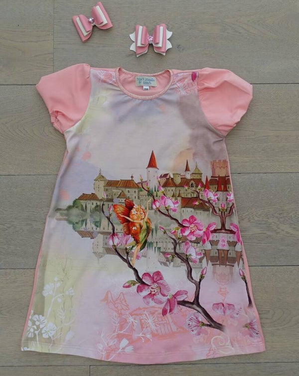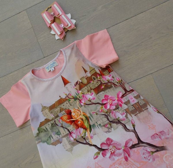 Jurk grote print : elfje kasteel bloementak, roze of fusia