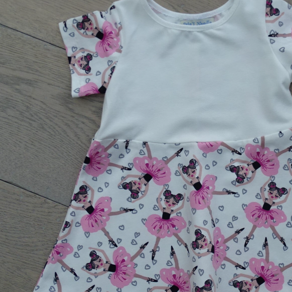 Jurk ballerina roos, kleine print, korte mouw, A-lijn rok