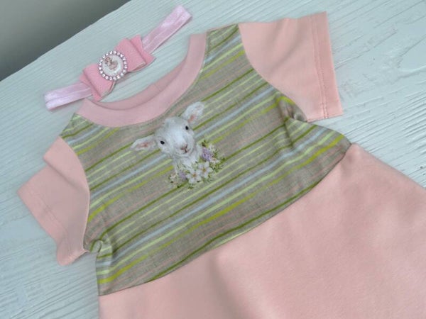 Jurk beige streep linnenkleur/roze/grote print schaapje, A-lijn rok