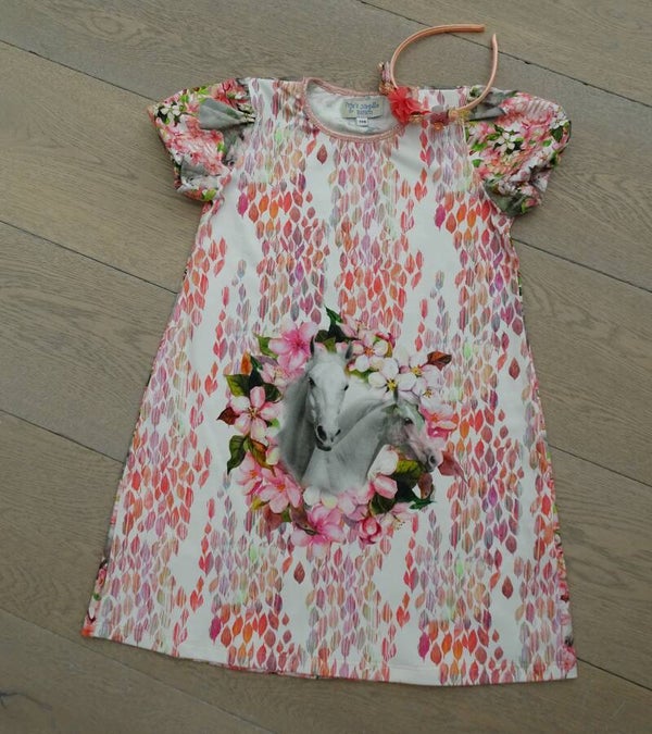 Jurk grote print : 2 witte paarden roze bloemenkrans