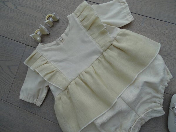 Boxpakje jurkmodel met linnen ruffle strook, pofbroekje damast katoen, gaat open met rits en drukknopen. Rimpelrok100% katoen/100% linnen