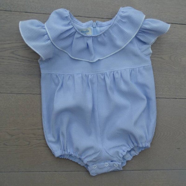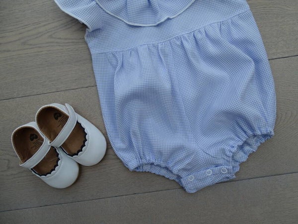 Zeer licht boxpakje met ruches aan mouw en hals, pofbroekje, gaat open met rits en drukknopen.