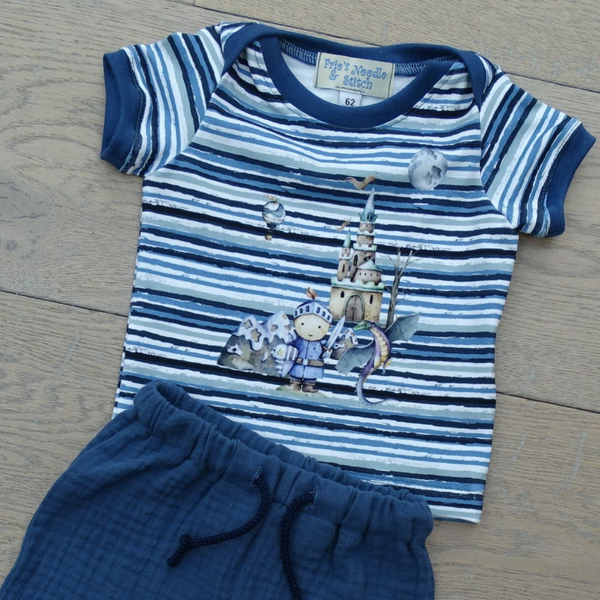 grote print streep ridder kasteel, broek blauwe gauze stof