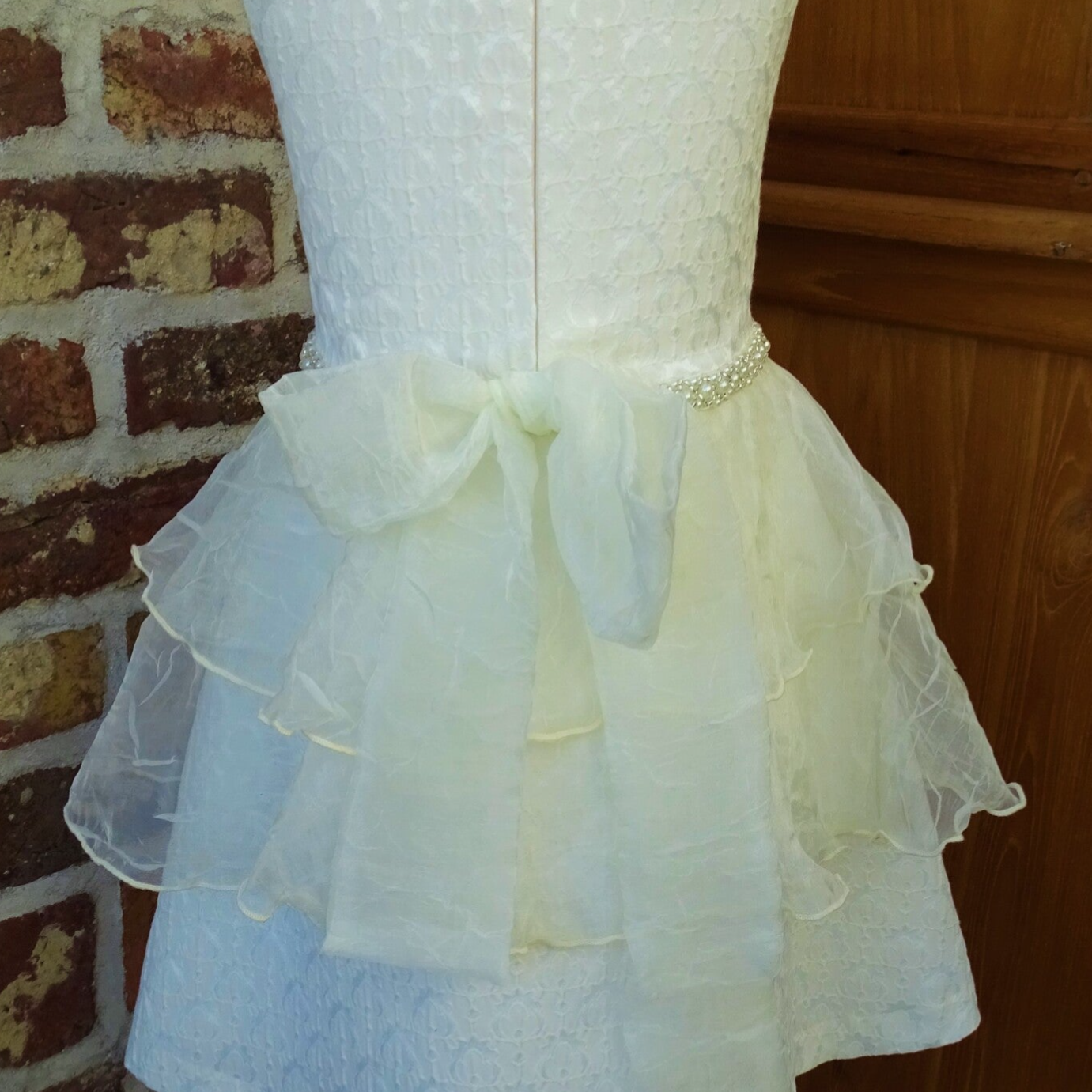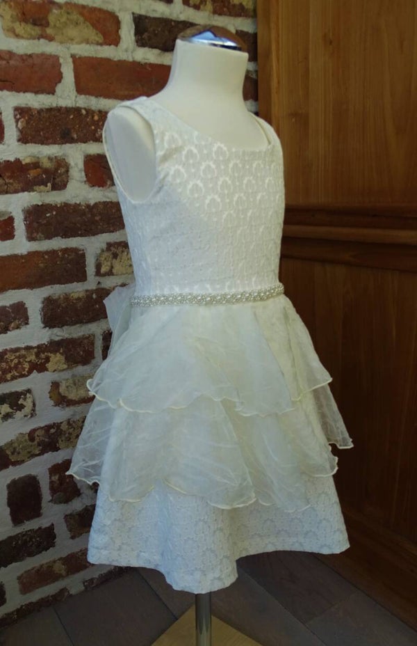 feestelijk jurk, stof in damast ecu, elastisch, volant in crinkle organza