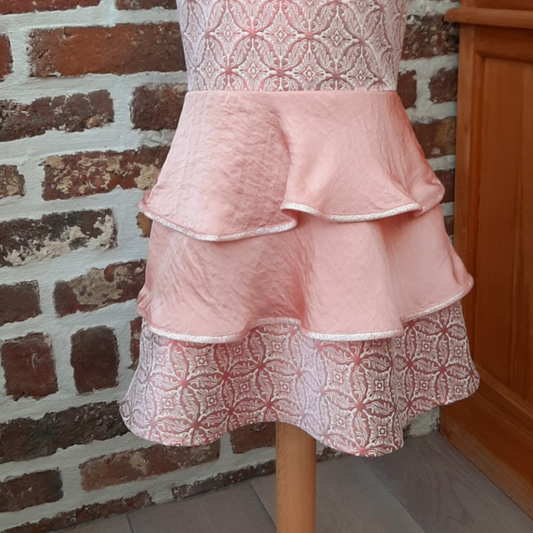 Feestelijk jurk, stof in damast roze, rok met dubbele volant in satijn roze,