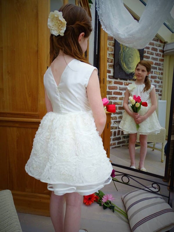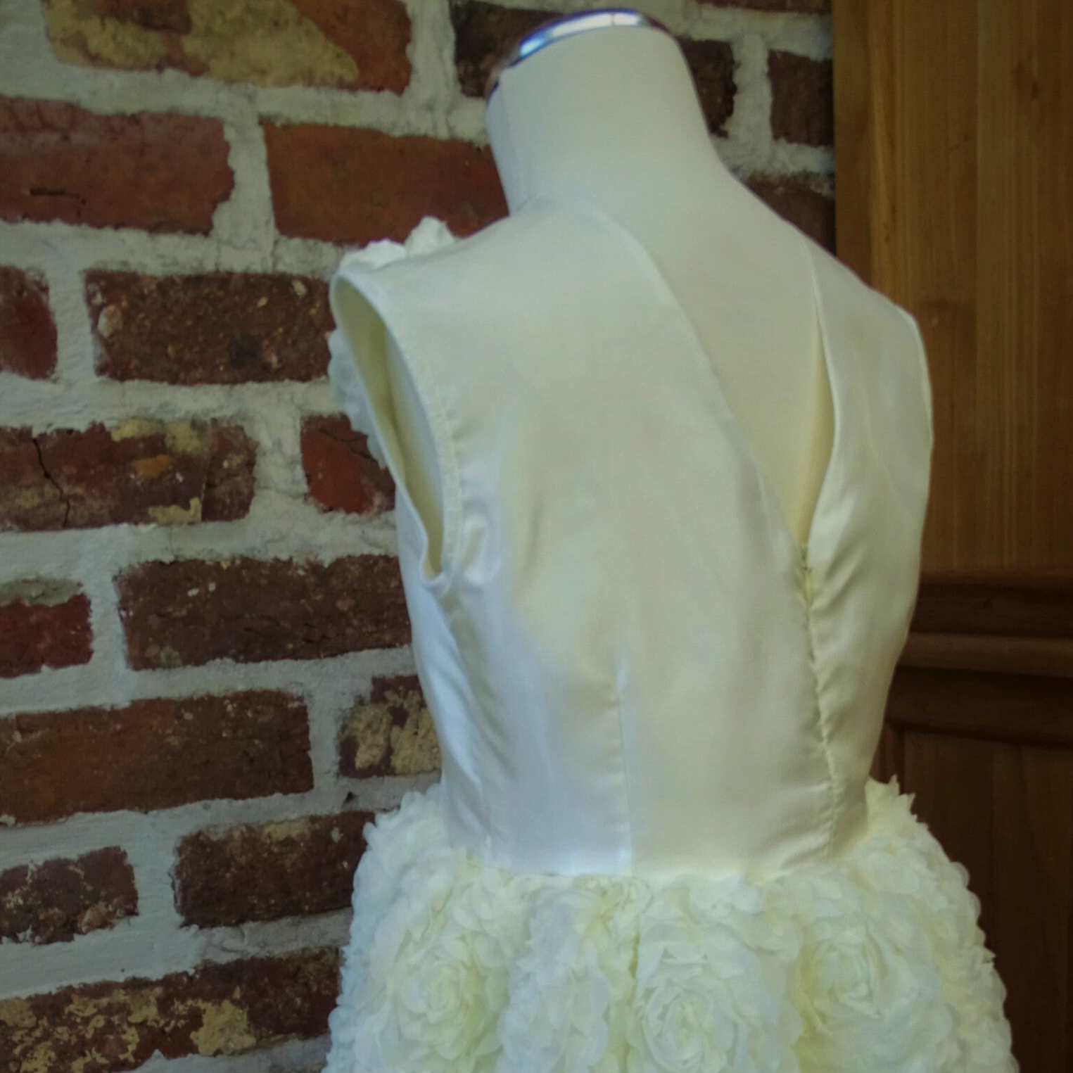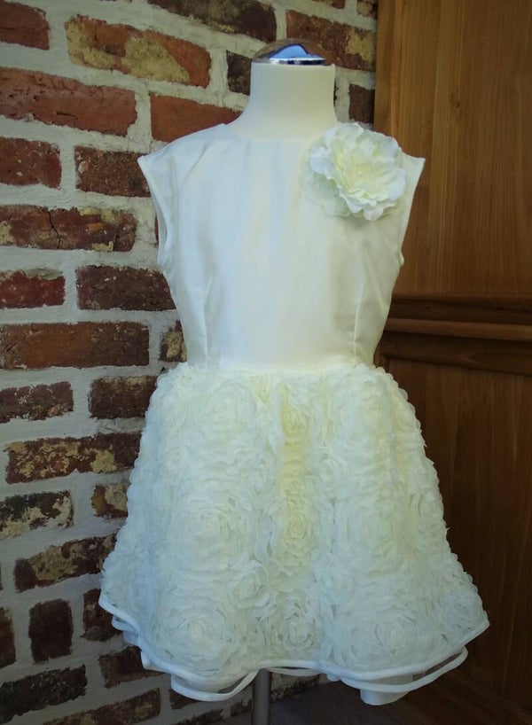 Feestelijk jurk, stof in ecru tafta, korte rok roosjestule, laagjesrok, sluiting rug v-opening rits.