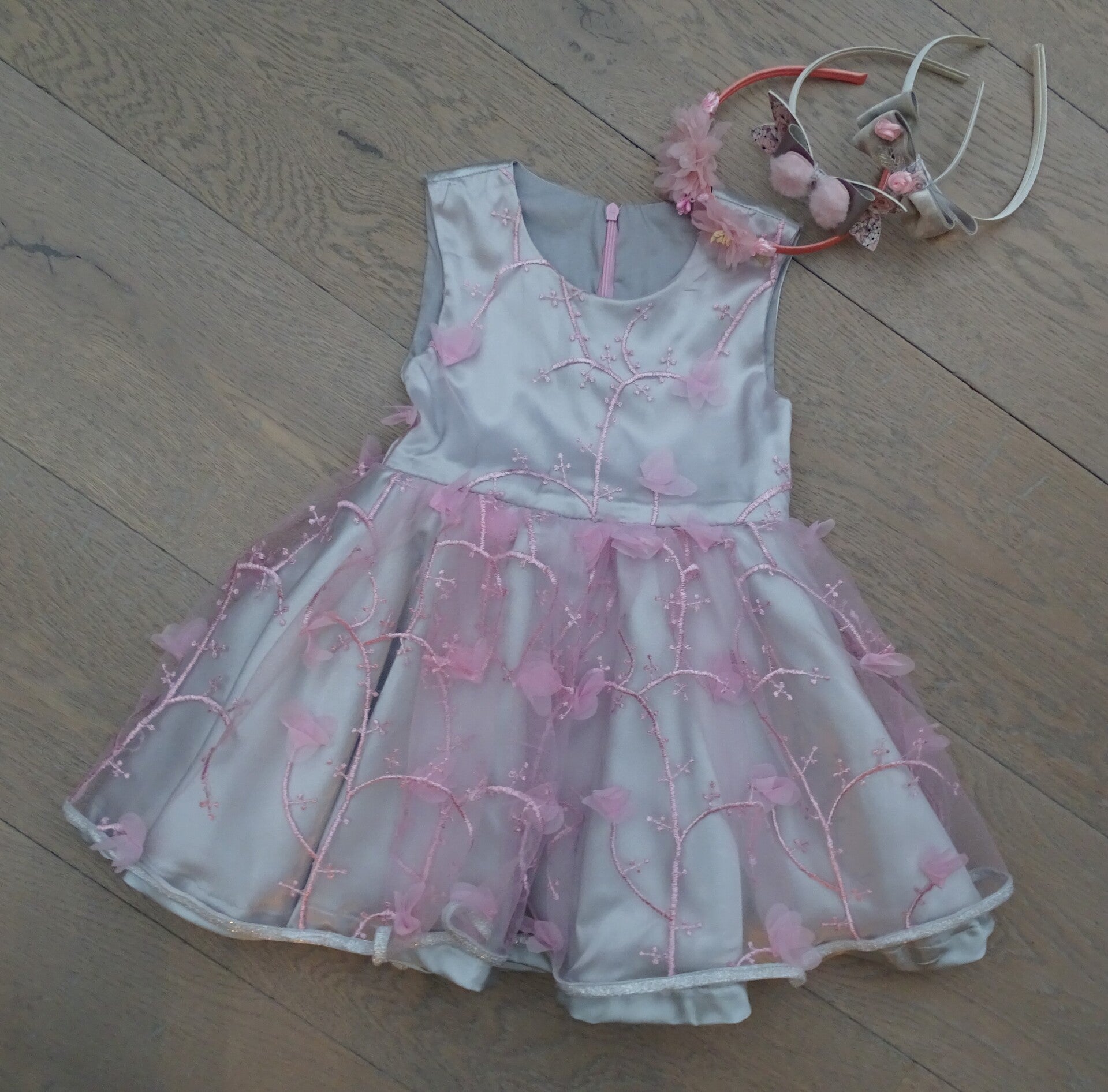 Feestelijke jurk m92 grijs satijn, roze 3D-tule