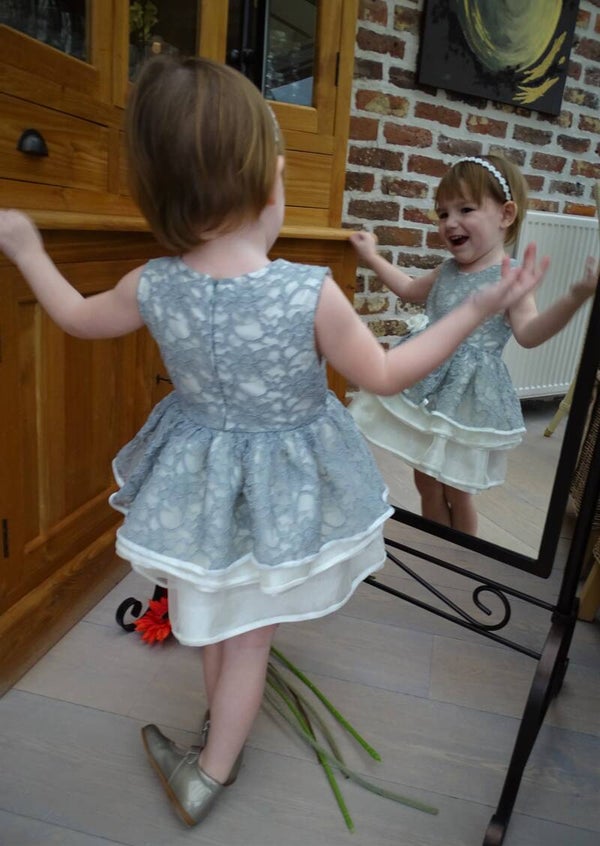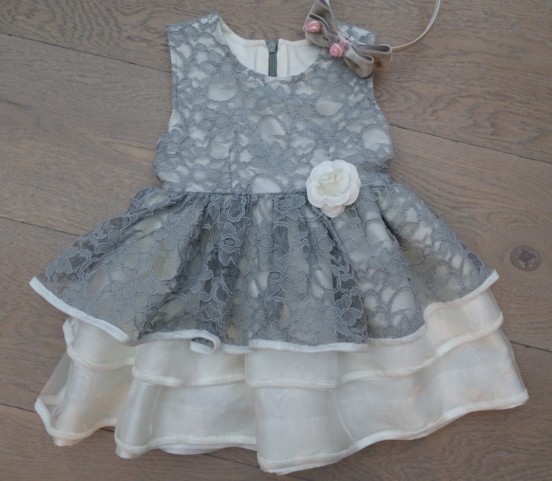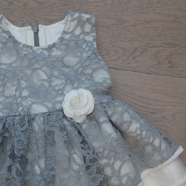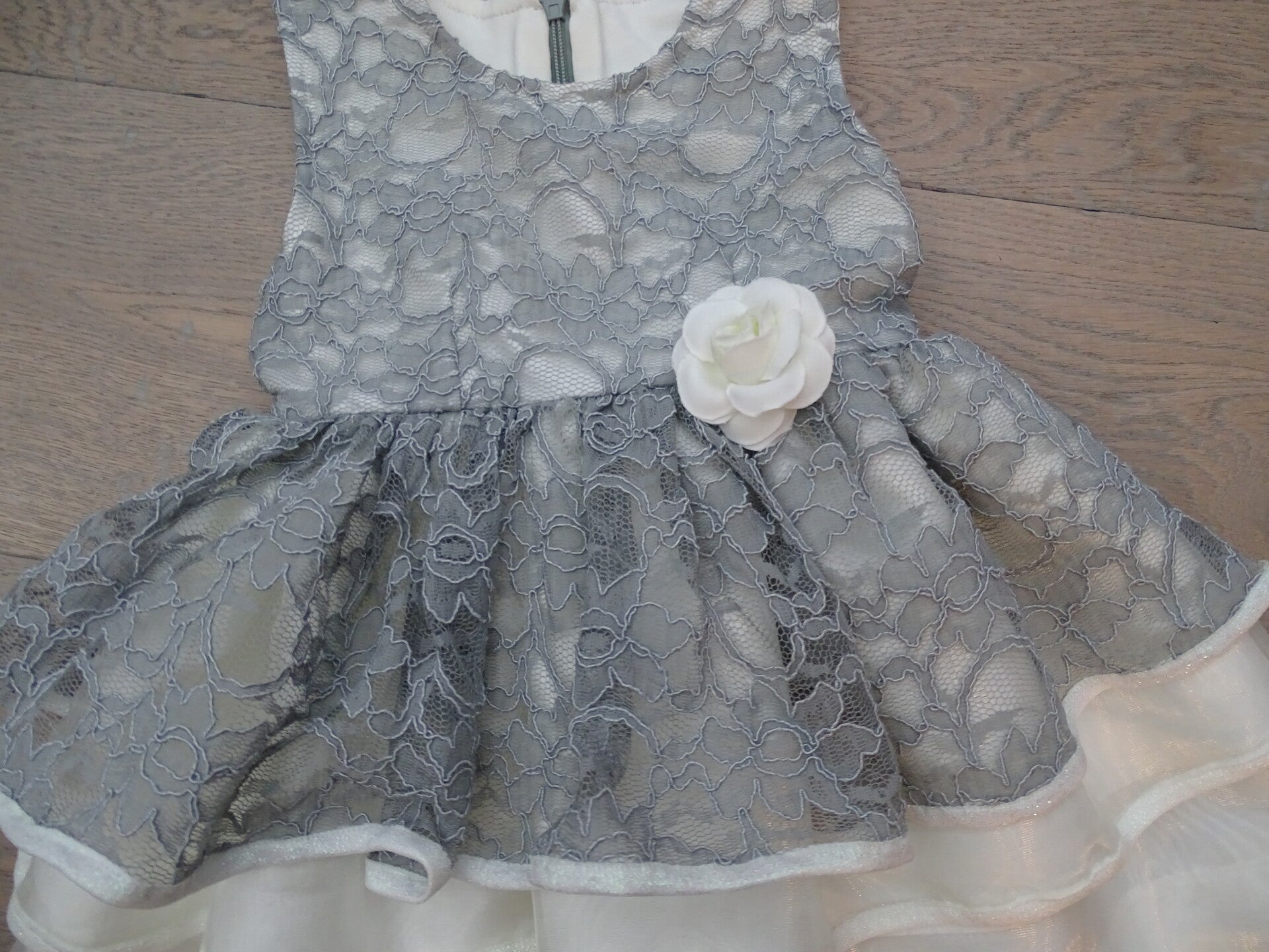 Feestelijk jurk, ecru tafta, bovenlaag grijze kant, laagjesrok, sluiting rug rits.