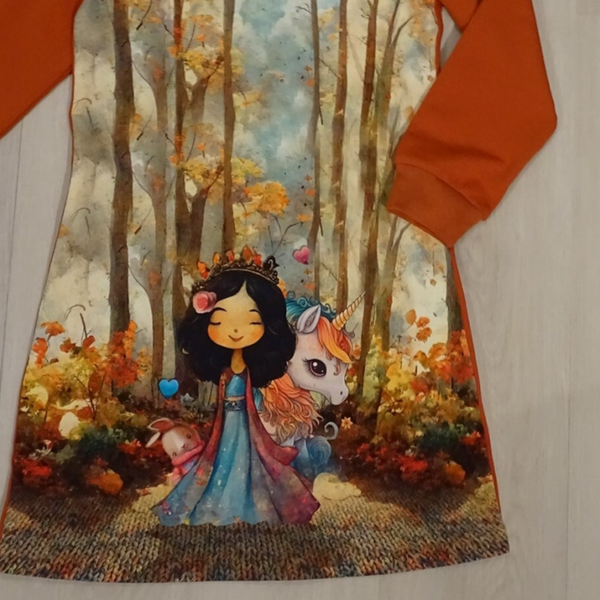 Sweaterjurk hoge taille, terracotta, meisje met unicorn in bos