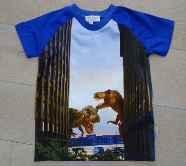 Tshirt dino's flatgebouw. Korte mouw, combinatiestof kleine dinoprint of kobaltblauw uni.