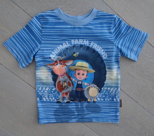 Tshirt boer koe schaap. Korte mouw, combinatiestof printstof streep/blauw uni.
