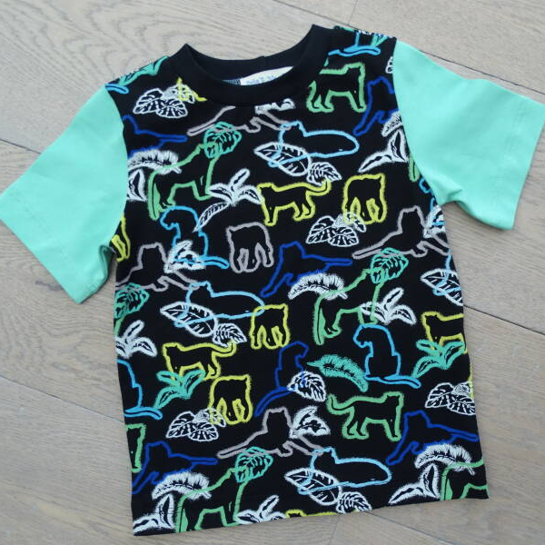 Tshirt jungledieren neonkleuren. Korte mouw, combinatiestof uni mintgroen, uni kobalt blauw of print all over.