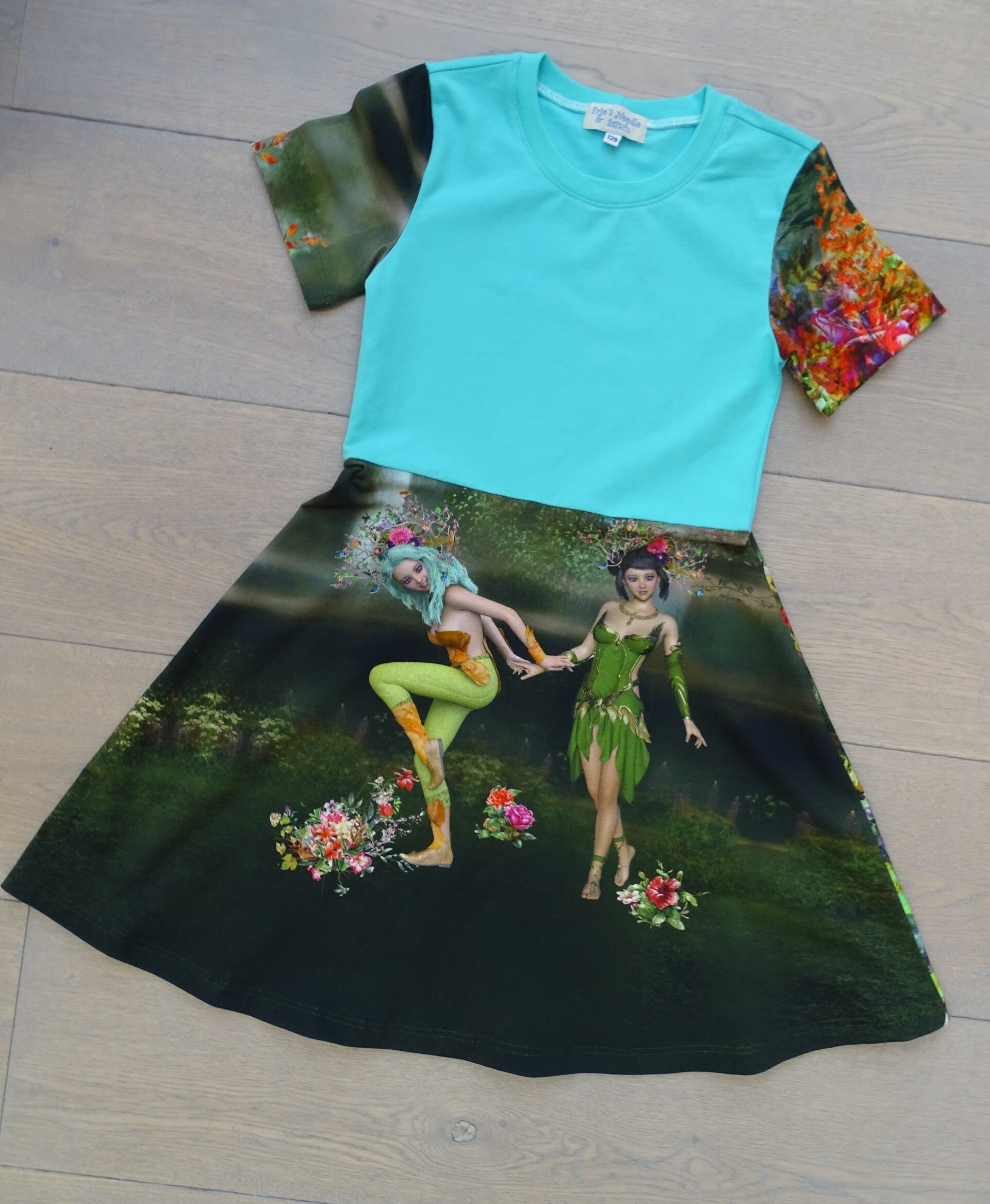 Jurk grote print : nimfen en unicorns donkergroen, bloemen
