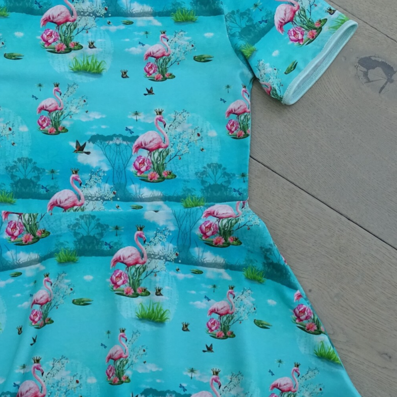 Jurk flamingo turquoise, kleine print, korte mouw, A-lijn rok