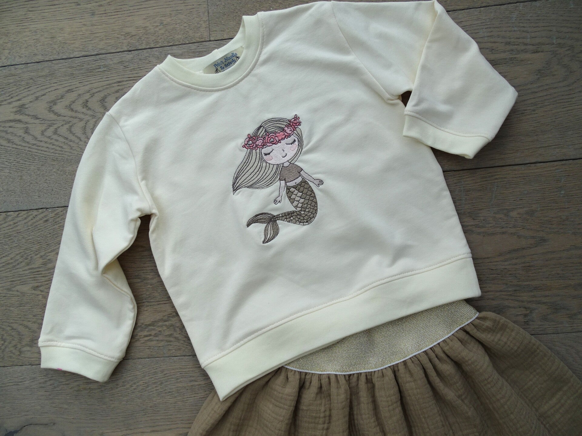 double gauze zand/ ecru met borduurtekening zeemeermin