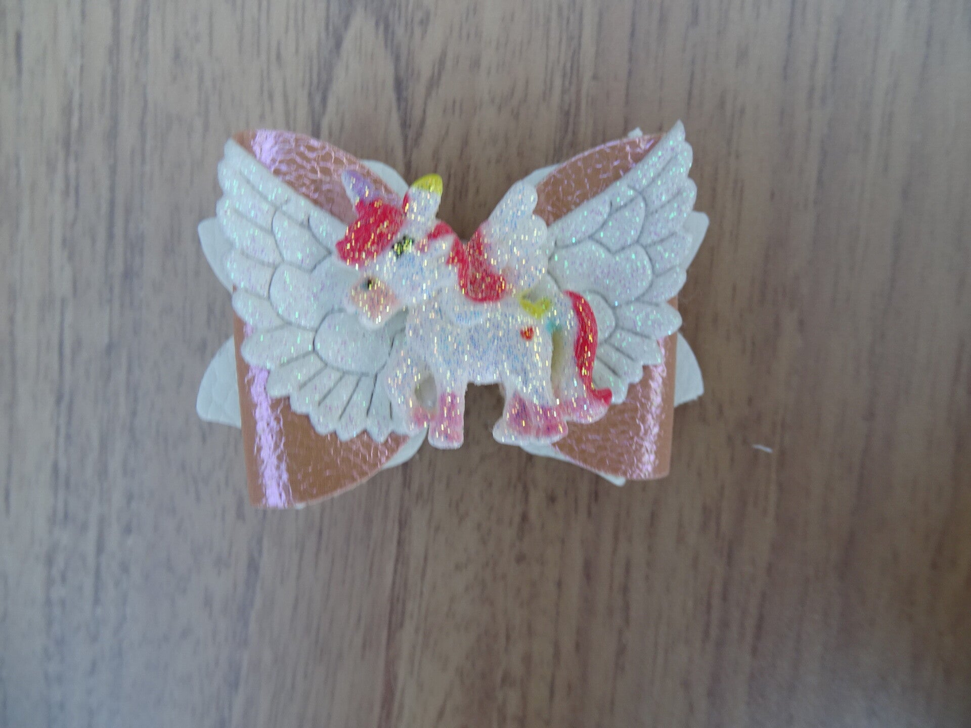 haarstrik roze/witte vleugels, unicornfiguurtje 3 lagen strik, op speld