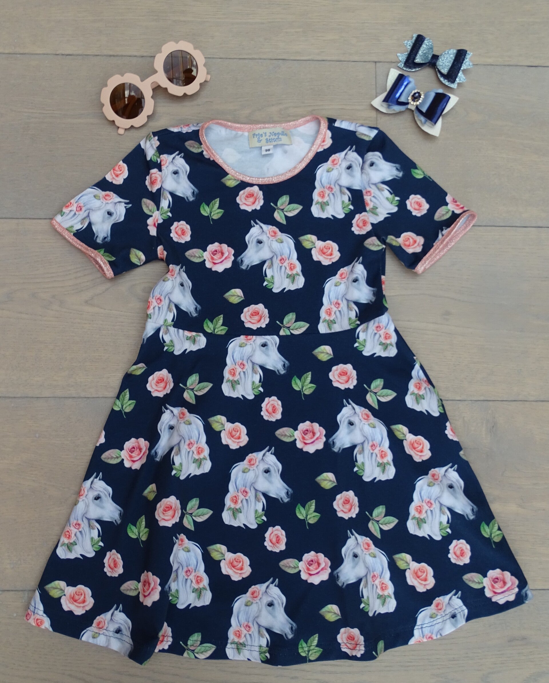 Jurk donkerblauw wit rozenpaard, kleine print, korte mouw, A-lijn rok