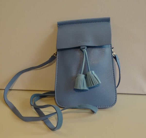 handtasje blauw langwerpig pompon floche