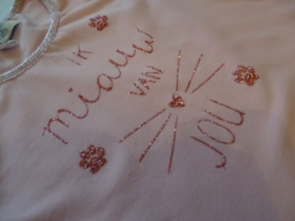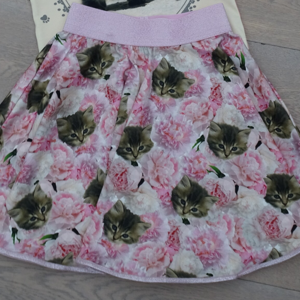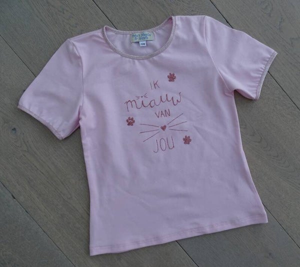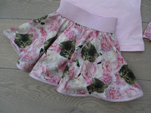 Rokje in kleine printstof rozen poesjes/shirt uni licht roze, bedrukking: "ik miauw van jou" roze glitter