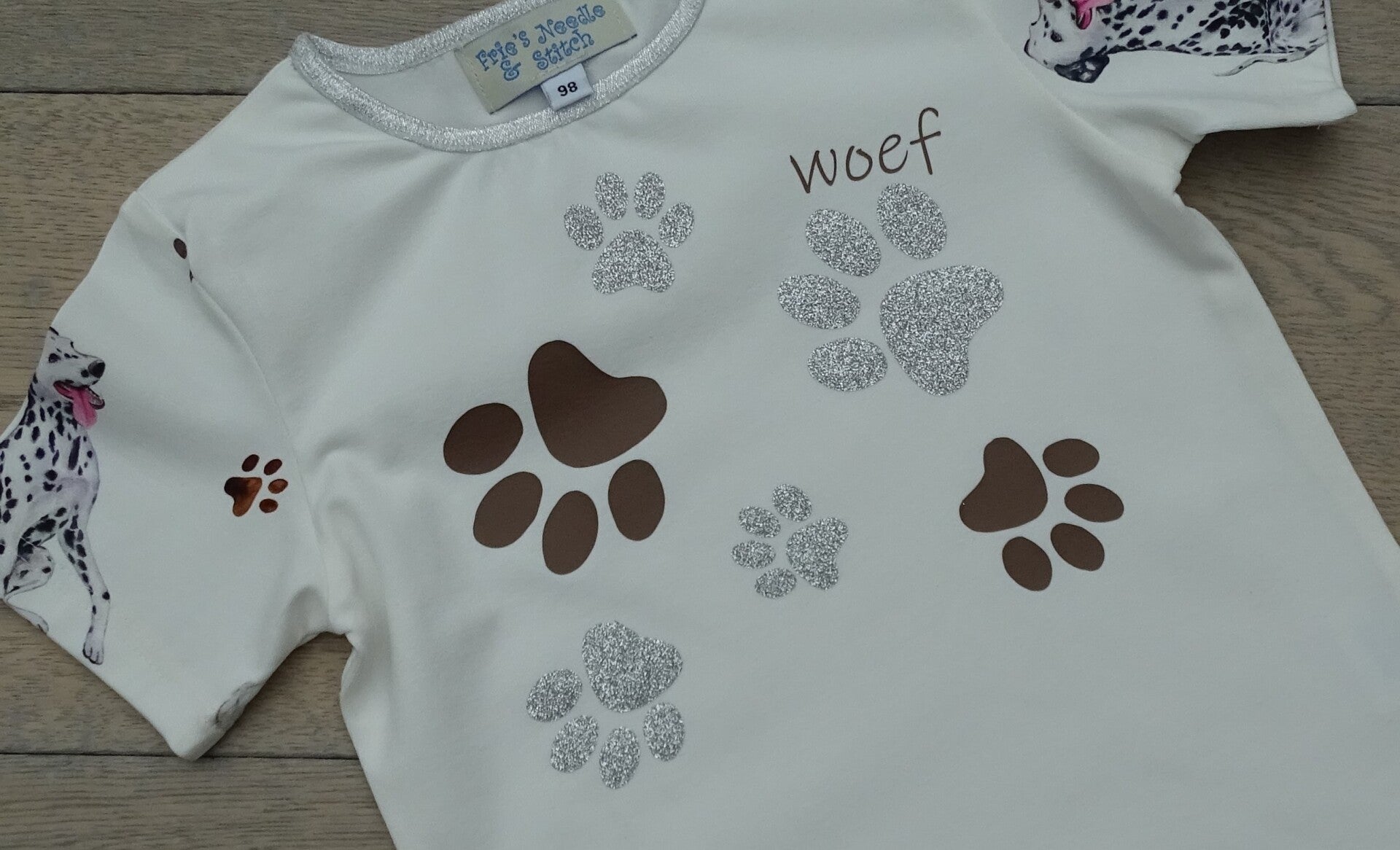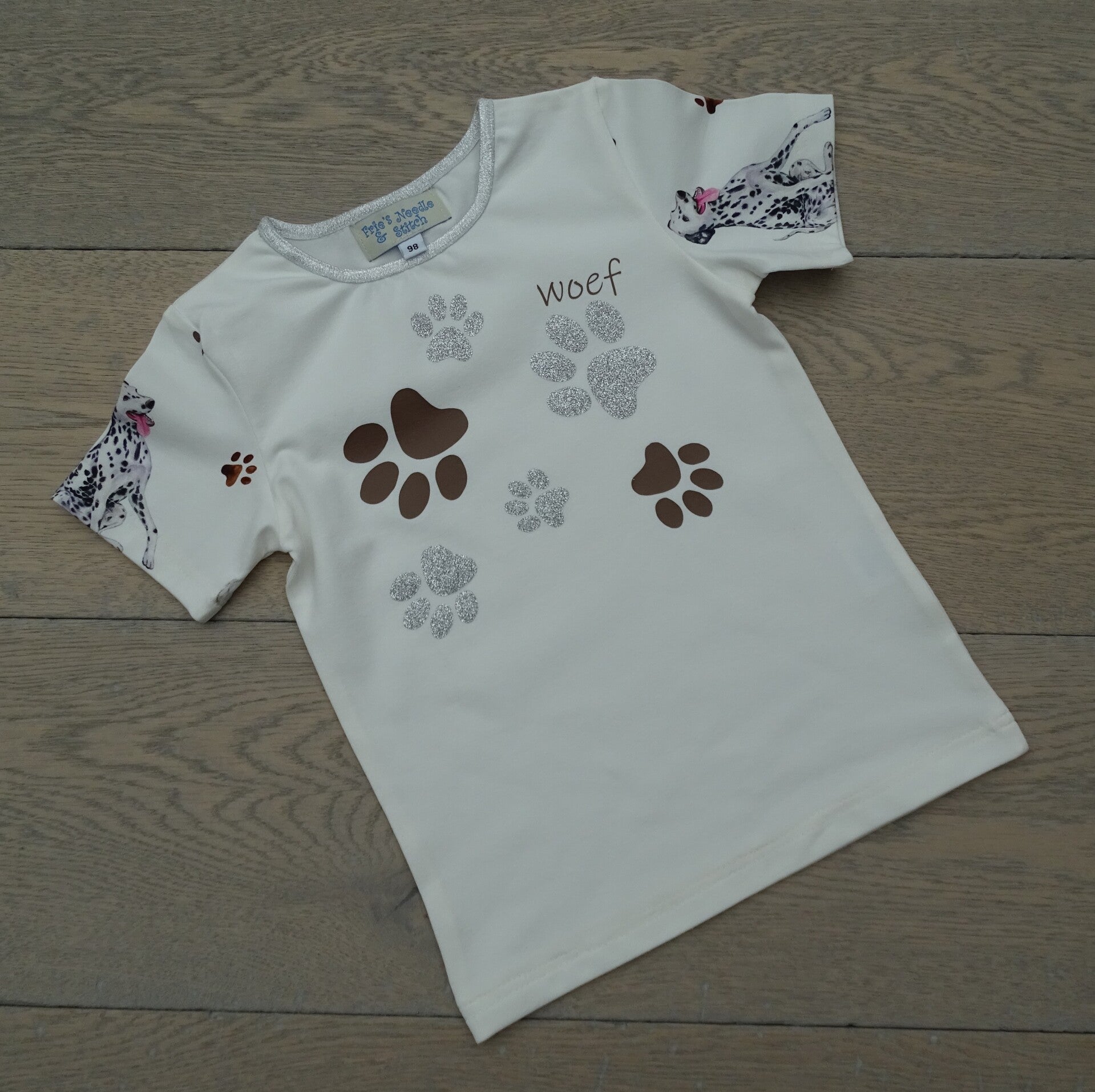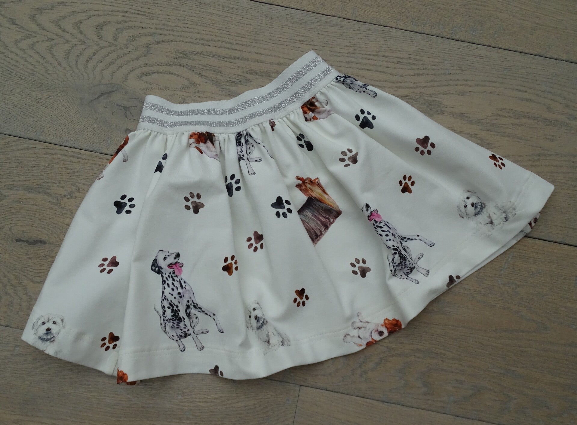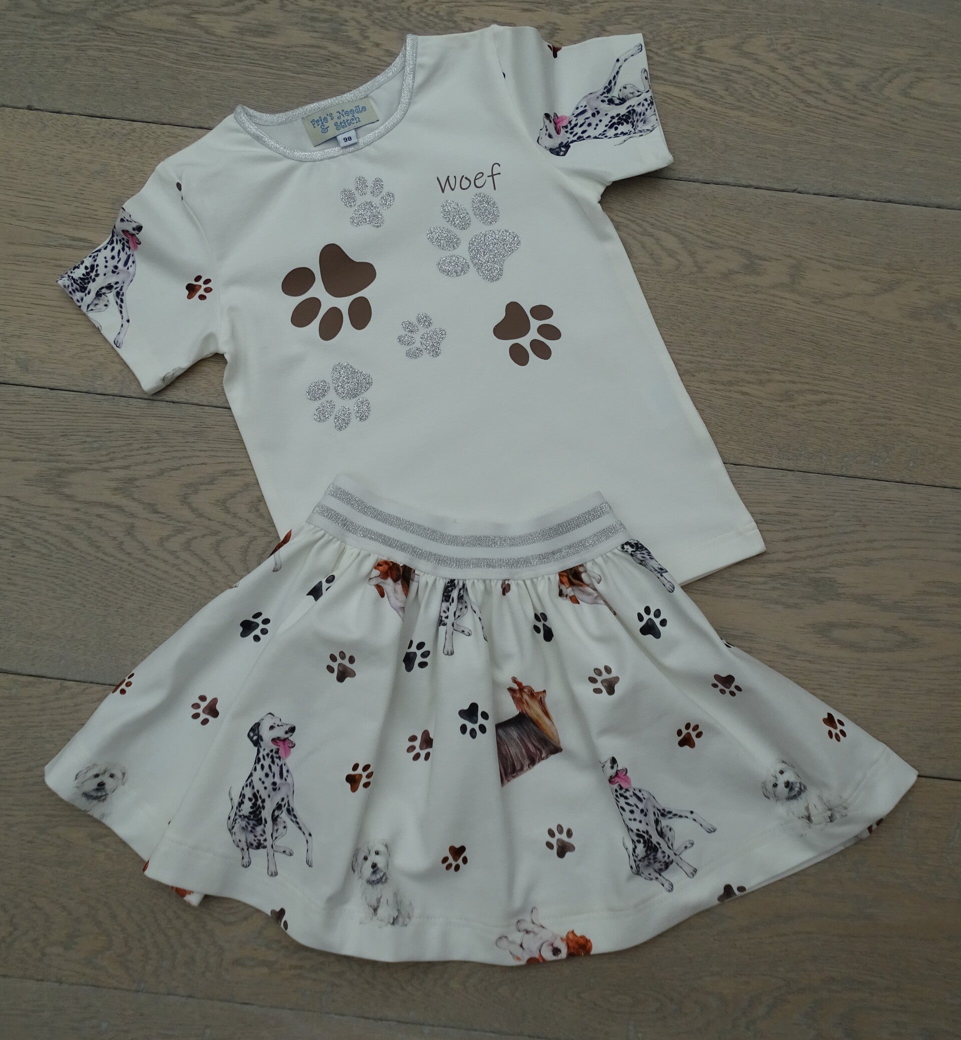 Rokje in printstof hondjes/shirt uni wit, bedrukkig hondepootjes zilver+ bruin