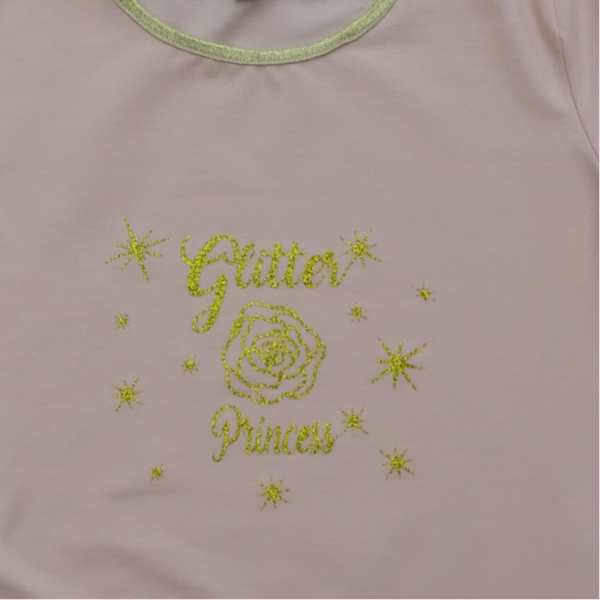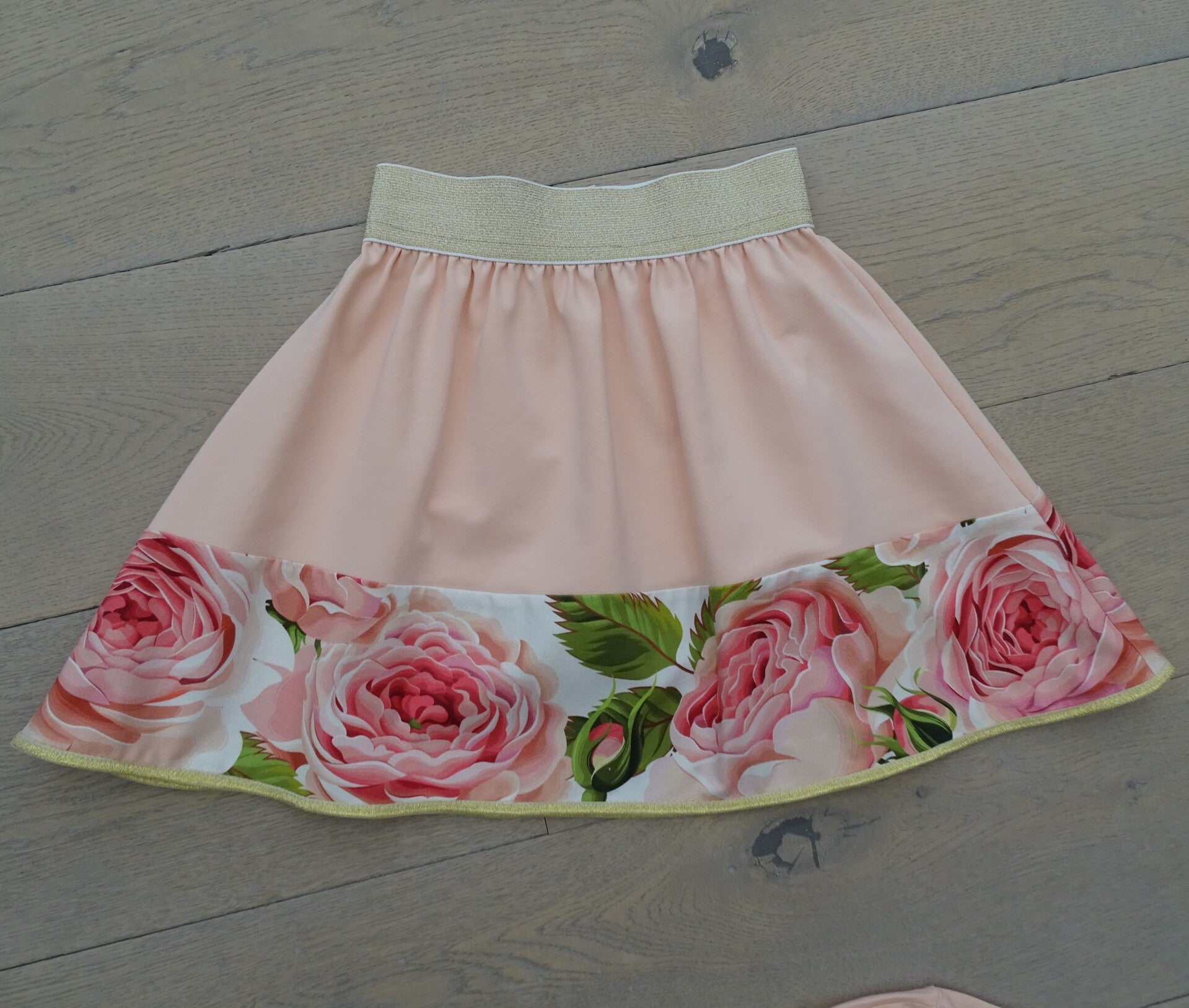 Rokje in printstof rozenband, uni zalmroze/shirt uni zalmroze, bedrukking: "glitterprincess"