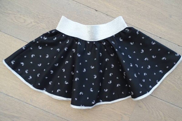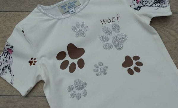 Rokje in printstof zwart/shirt uni wit, bedrukkig hondepootjes zilver+ bruin