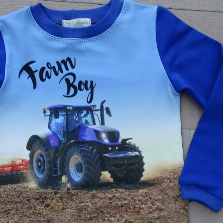 voorpand grote tractorprint/achterpand en mouw kobaltblauw