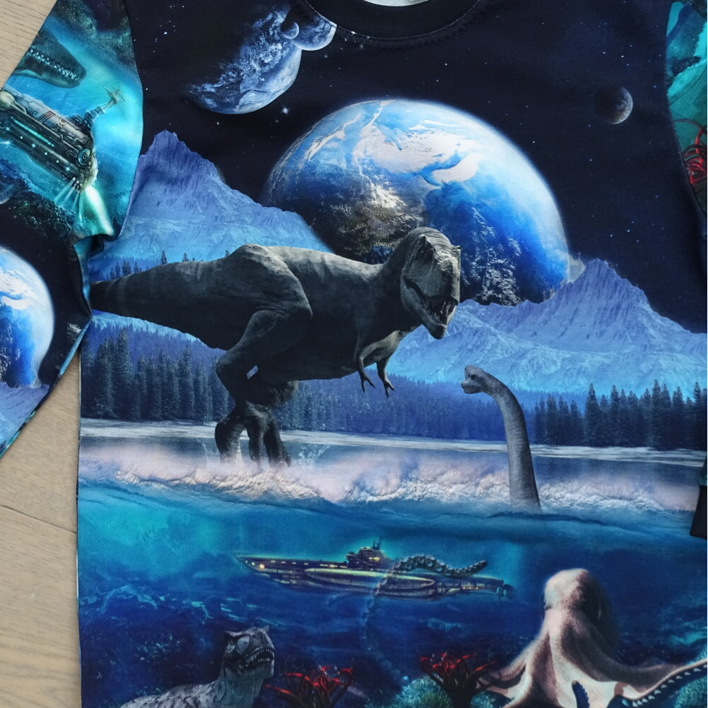 voorpand grote dinoprint/achterpand en mouw kleine print of uni felblauw