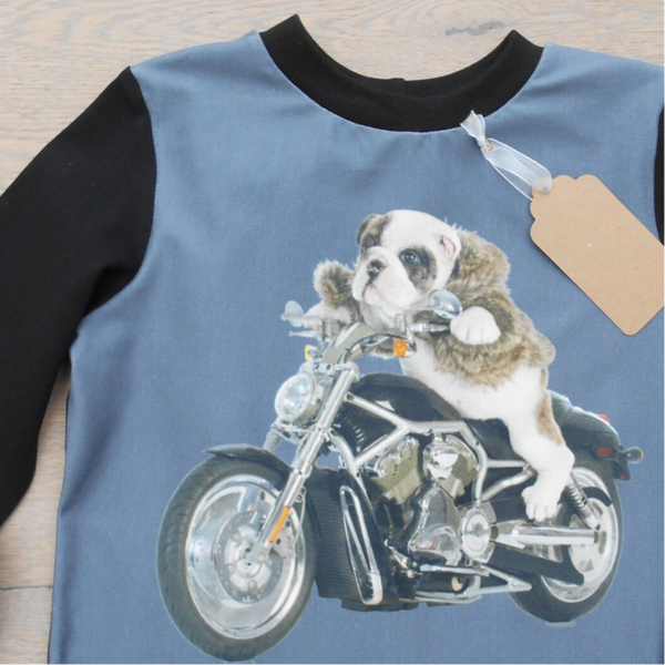 Tshirt motohond grijs. Combinatiestof kleine print of uni zwart.