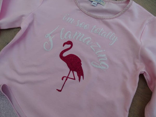 roze/ bedrukking flamazing wit/roos glitter (past bij rokje flamingo)