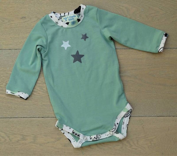 baby setje: licht groen romper + legging rokje planeten
