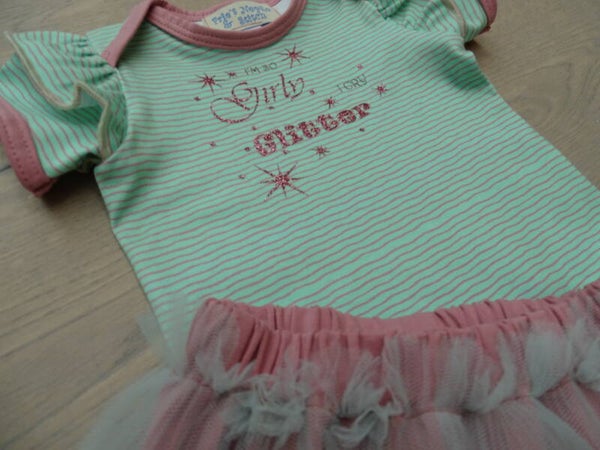 romper met frullemouw en bedrukking, bloomerbroekje met tule