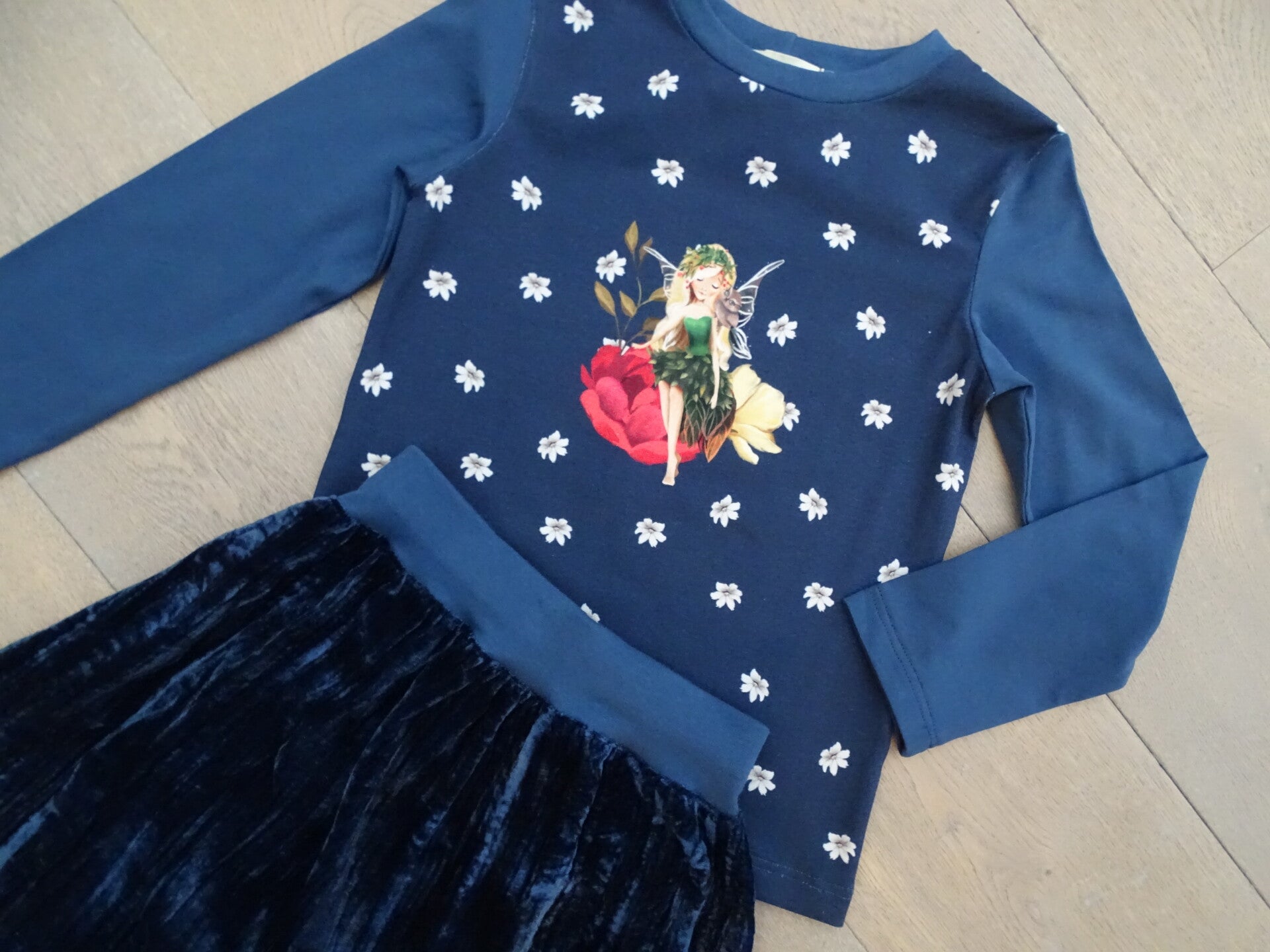 longsleeve donkerblauw elfje op bloem/rimpelrok kreukfluweel donkerblauw