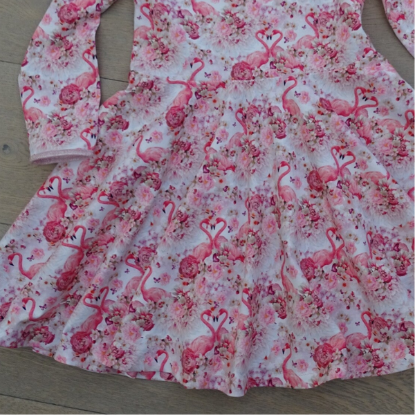 Jurk flamingo felroze, kleine print, cirkelrok (zwierrok)