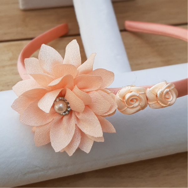 zalmroze fantasiebloemen, parel op roze diadeem